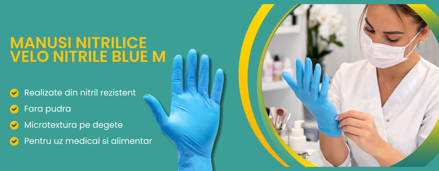 Manusi nitrilice Velo Nitrile Blue M, fara pudra, nesterile, microtextura pe degete, ambidextre, pentru uz medical si alimentar, 100 bucati