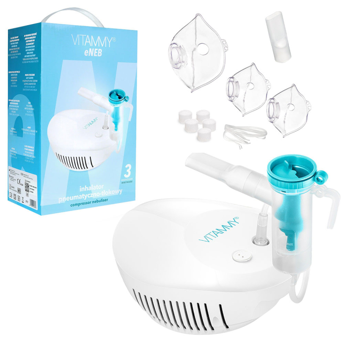 Aparat de aerosoli Vitammy eNEB, nebulizator cu compresor, 3 moduri de nebulizare, 3 masti, piesa bucala, furtun de 1.6 m, 5 filtre aer, oprire automata
