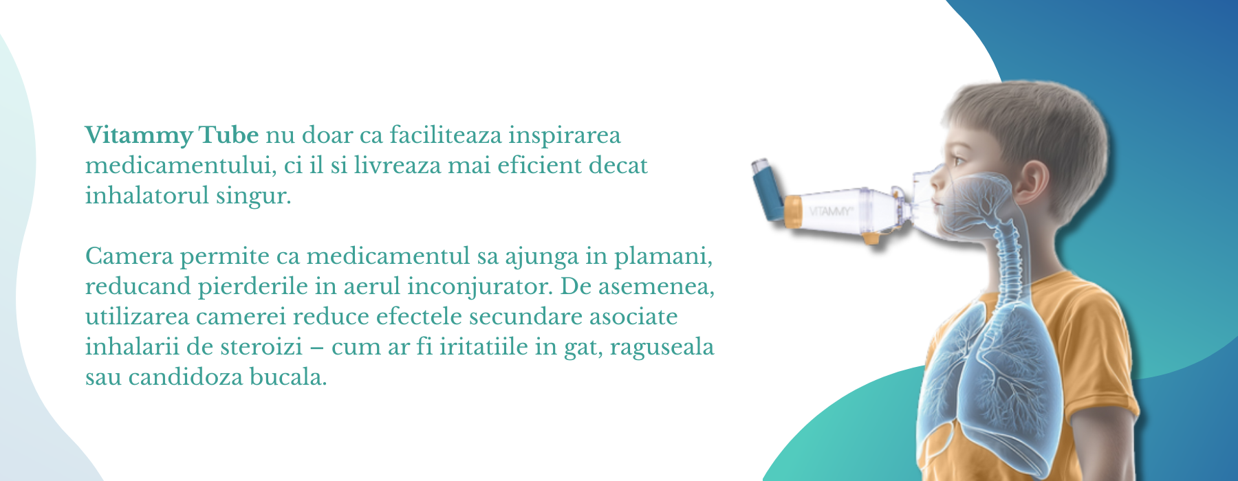 Vitammy Tube nu doar ca faciliteaza inhalarea medicamentului, dar il si livreaza mai eficient decat inhalatorul simplu. Camera directioneaza medicamentul direct in plamani, reducand pierderile in aerul inconjurator. In plus, utilizarea camerei reduce efectele adverse ale steroizilor inhalatori, cum ar fi iritatiile gatului, raguseala si candidoza orala.