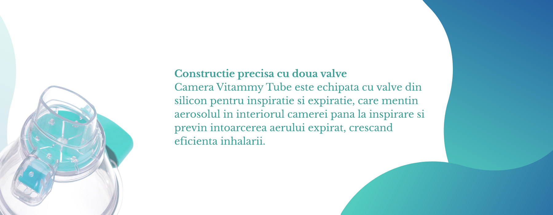 Camera Vitammy Tube este echipata cu valve din silicon pentru inspir si expir, care mentin aerosolul in interiorul camerei pana la momentul inspiratiei si previn reintoarcerea aerului expirat in camera, sporind eficienta tratamentului.