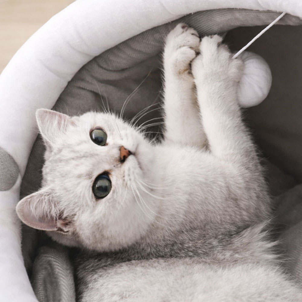 Casuta pentru pisici tip igloo RedLine, cu jucarie, pat moale pentru pisica, interior cald si confortabil, 31x27x27 cm, Gri