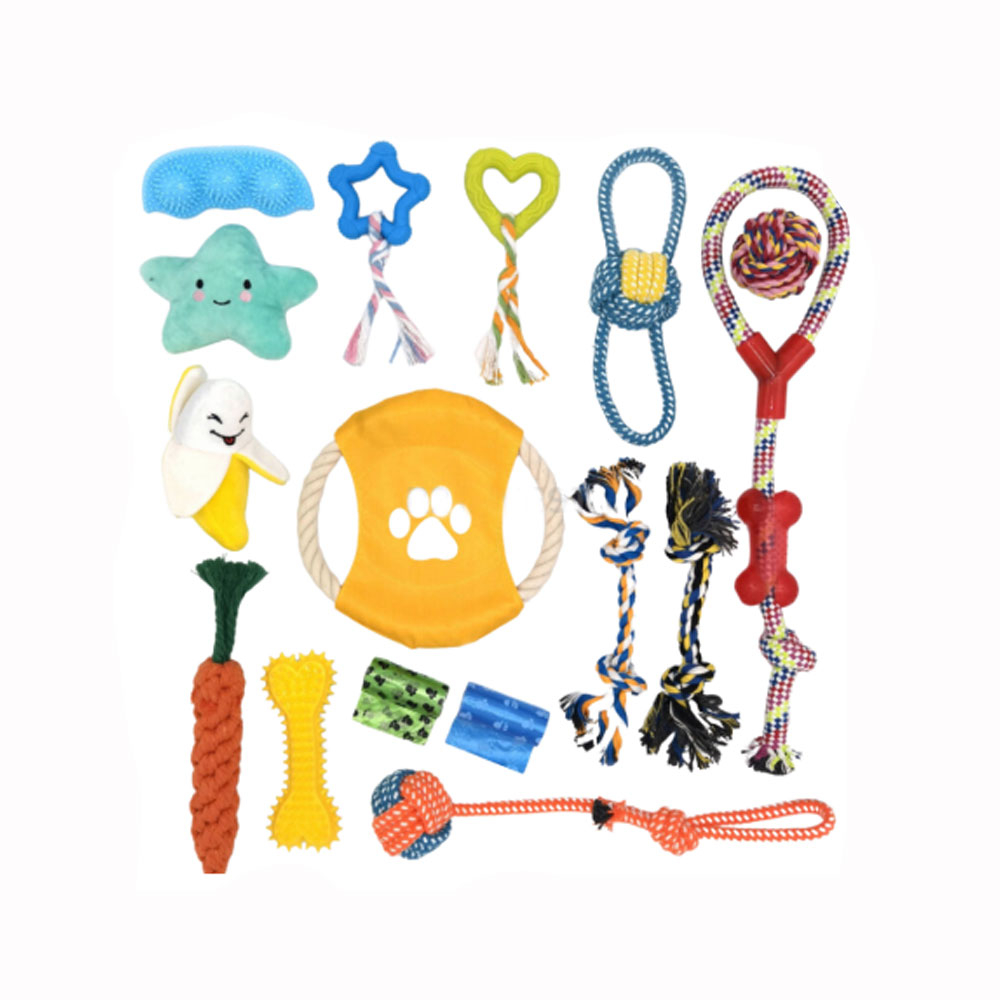 Set jucarii pentru caini, jucarii de ros, sfoara, minge, frisbee, pungi pentru plimbare, 16 piese