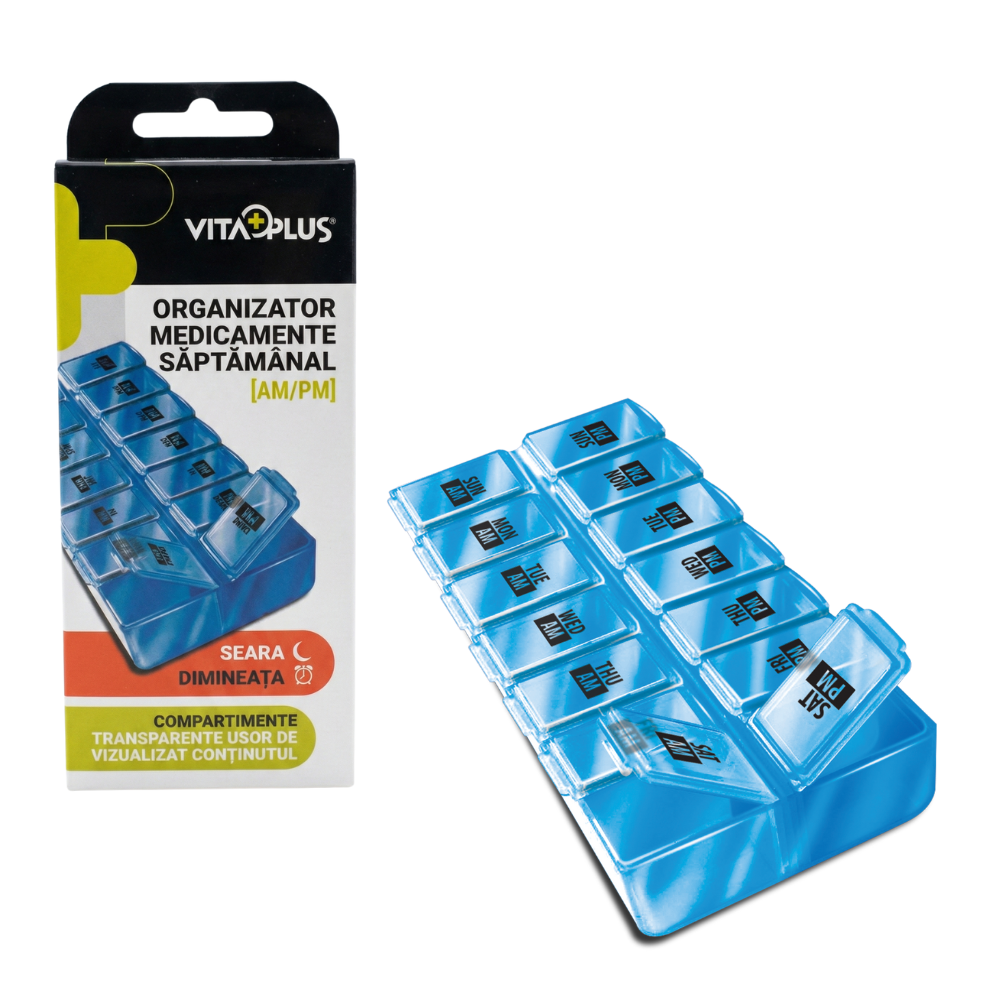 Organizator medicamente saptamanal VitaPlus, cu 14 compartimente, design compact si portabil