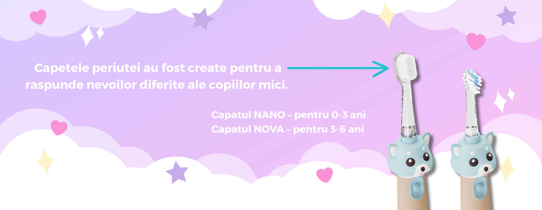 Capetele periutei au fost create pentru a raspunde nevoilor diferite ale copiilor mici. Periuta ramane utila mai mult timp si ofera periaj adaptat varstei.