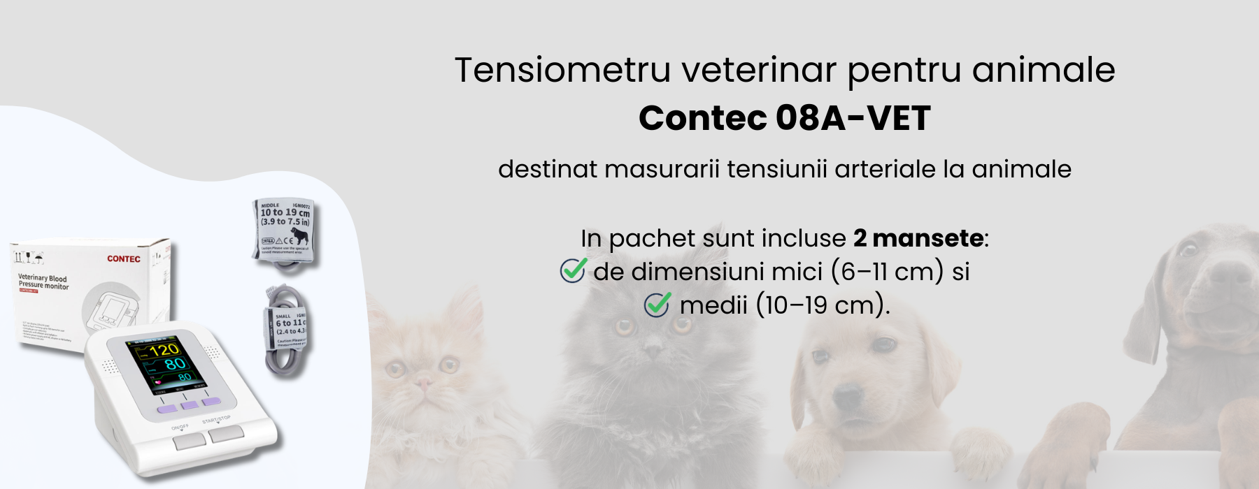 Pentru adaptare la diferite tipuri de animale, sunt disponibile trei moduri de manseta: mica, medie si mare.