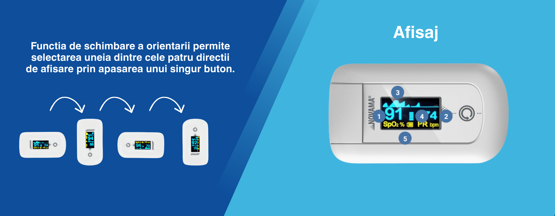 Dispozitivul porneste automat atunci cand degetul este introdus si se opreste singur la aproximativ 8 secunde dupa scoaterea degetului. Aceasta functie ajuta la economisirea energiei si la prelungirea duratei de utilizare a bateriei.