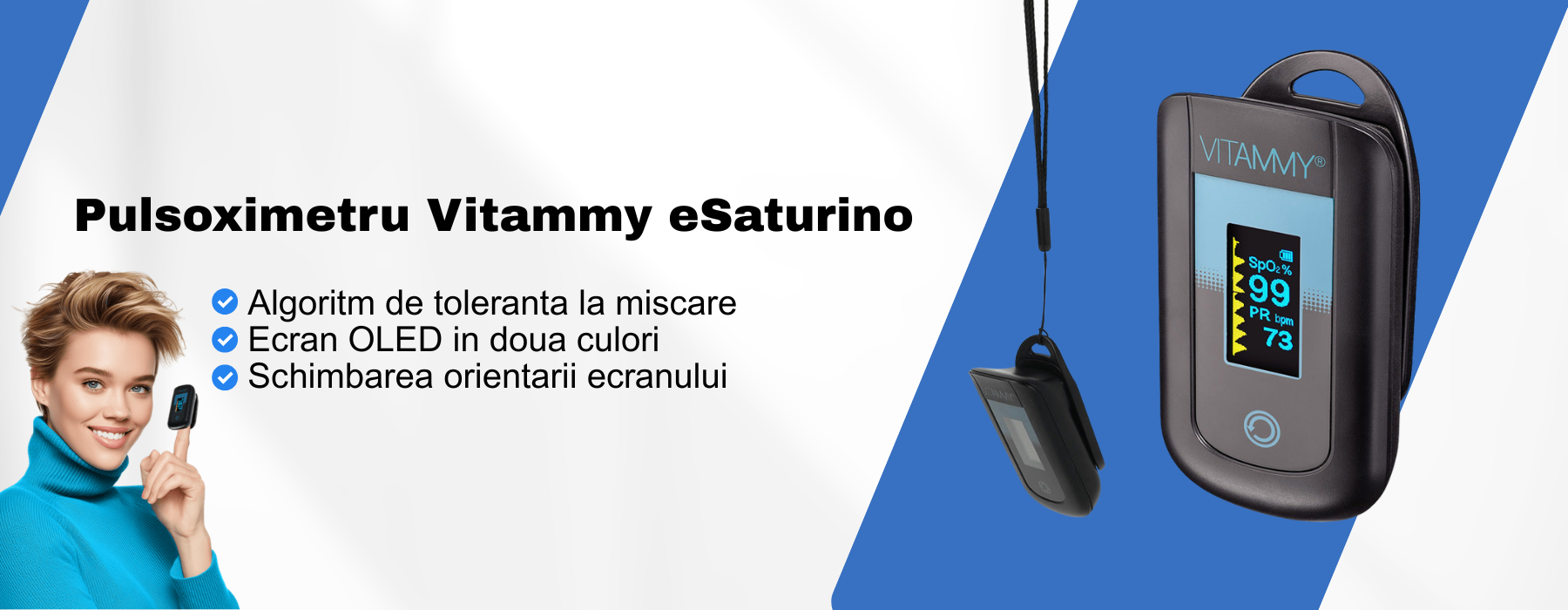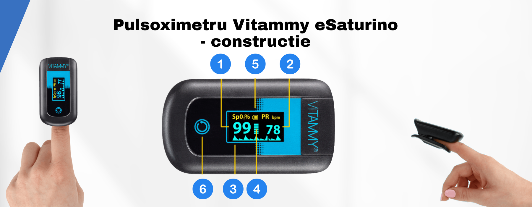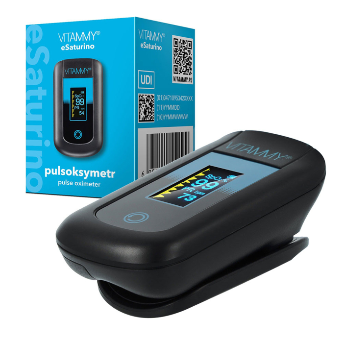 Pulsoximetru Vitammy eSaturino este un dispozitiv medical neinvaziv, reutilizabil, care masoara rapid si precis saturatia de oxigen a hemoglobinei din sange (SpO2) si pulsul (PR). Functioneaza pe baza principiului spectrofotometriei, folosind doua lungimi de unda ale luminii care trec prin vasele capilare din varful degetului.