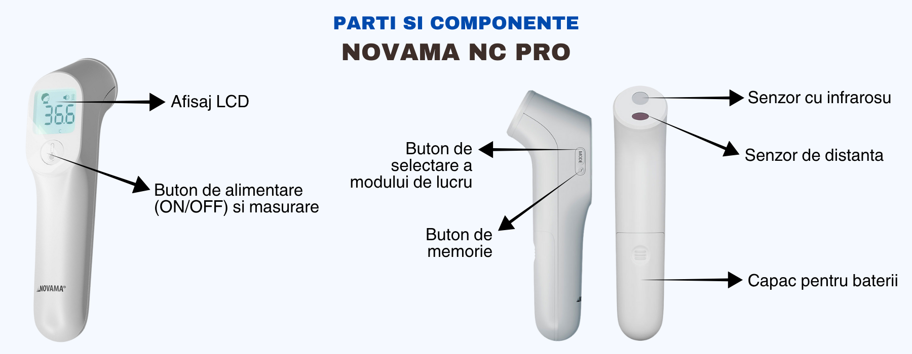 Termometru non-contact Novama NC Pro, pentru masurarea temperaturii corpului si a suprafetelor, memorie pentru 12 masuratori, 2 senzori separati, alarma febra, ecran iluminat, mod silentios, etui
